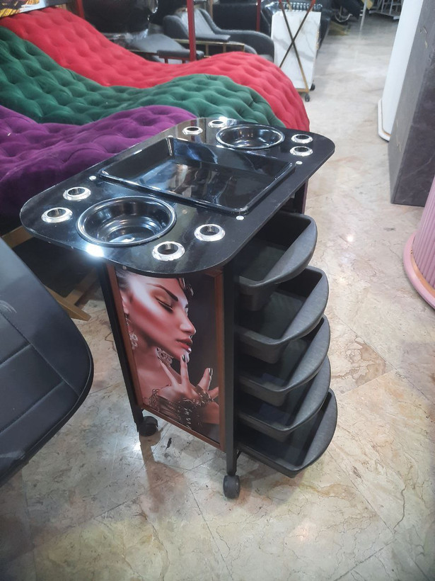 ترولی آرایشگاهی عکس دار پایه پلاستیکی پنج طبقه
